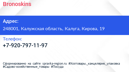 Bronoskins по адресу 248001, Калужская область, Калуга, Кирова, 19 в дальнейшем Организация, размещена в следующих категориях: