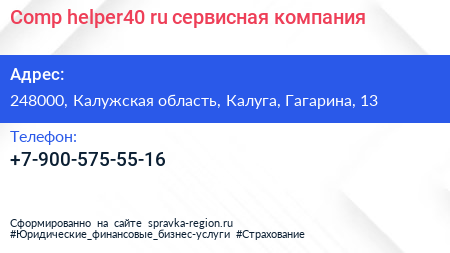 Comp-helper40.ru, сервисная компания по адресу 248000, Калужская область, Калуга, Гагарина, 13 в дальнейшем Организация, размещена в следующих категориях:
