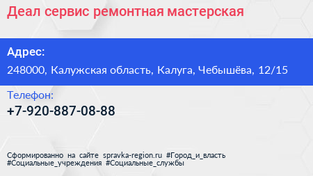Деал-сервис, ремонтная мастерская по адресу 248000, Калужская область, Калуга, Чебышёва, 12/15 в дальнейшем Организация, размещена в следующих категориях: