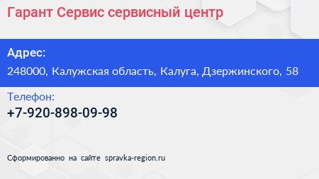 Гарант-Сервис, сервисный центр по адресу 248000, Калужская область, Калуга, Дзержинского, 58 в дальнейшем Организация, размещена в следующих категориях: