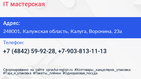 IT-мастерская по адресу 248001, Калужская область, Калуга, Воронина, 23а в дальнейшем Организация, размещена в следующих категориях: