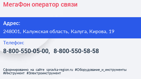 МегаФон, оператор связи по адресу 248001, Калужская область, Калуга, Кирова, 19 в дальнейшем Организация, размещена в следующих категориях: