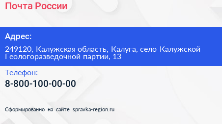 Почта России по адресу 249120, Калужская область, Калуга, село Калужской Геологоразведочной партии, 13 в дальнейшем Организация, размещена в следующих категориях: