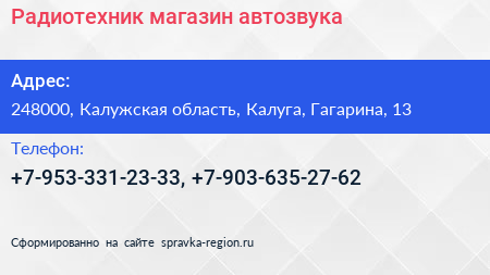 Радиотехник, магазин автозвука по адресу 248000, Калужская область, Калуга, Гагарина, 13 в дальнейшем Организация, размещена в следующих категориях: