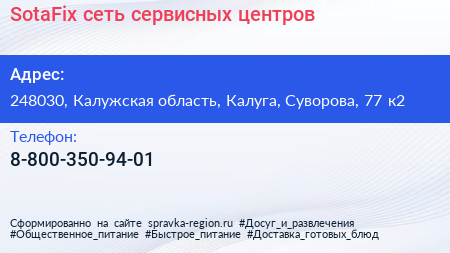 SotaFix, сеть сервисных центров по адресу 248030, Калужская область, Калуга, Суворова, 77 к2 в дальнейшем Организация, размещена в следующих категориях: