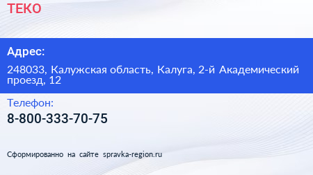 ТЕКО по адресу 248033, Калужская область, Калуга, 2-й Академический проезд, 12 в дальнейшем Организация, размещена в следующих категориях: