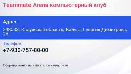 Teammate Arena, компьютерный клуб по адресу 248033, Калужская область, Калуга, Георгия Димитрова, 26 в дальнейшем Организация, размещена в следующих категориях: