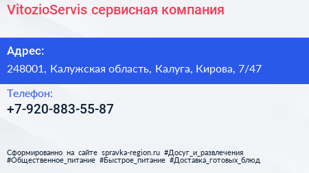 VitozioServis, сервисная компания по адресу 248001, Калужская область, Калуга, Кирова, 7/47 в дальнейшем Организация, размещена в следующих категориях: