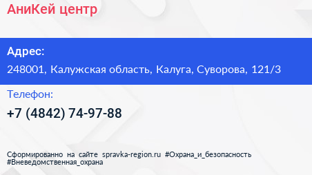 АниКей, центр по адресу 248001, Калужская область, Калуга, Суворова, 121/3 в дальнейшем Организация, размещена в следующих категориях: