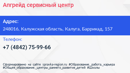 Апгрейд, сервисный центр по адресу 248016, Калужская область, Калуга, Баррикад, 157 в дальнейшем Организация, размещена в следующих категориях: