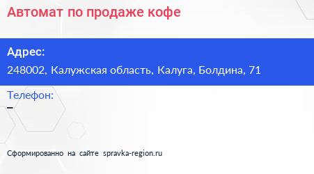 Автомат по продаже кофе по адресу 248002, Калужская область, Калуга, Болдина, 71 в дальнейшем Организация, размещена в следующих категориях: