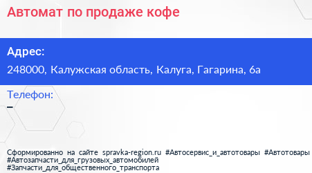 Автомат по продаже кофе по адресу 248000, Калужская область, Калуга, Гагарина, 6а в дальнейшем Организация, размещена в следующих категориях:
