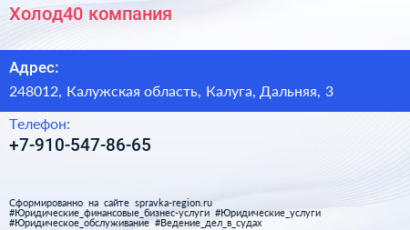 Холод40, компания по адресу 248012, Калужская область, Калуга, Дальняя, 3 в дальнейшем Организация, размещена в следующих категориях: