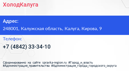 ХолодКалуга по адресу 248001, Калужская область, Калуга, Кирова, 9 в дальнейшем Организация, размещена в следующих категориях: