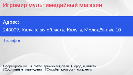Игромир, мультимедийный магазин по адресу 248009, Калужская область, Калуга, Молодёжная, 10 в дальнейшем Организация, размещена в следующих категориях: