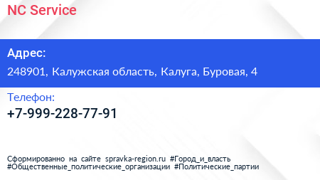 NC-Service по адресу 248901, Калужская область, Калуга, Буровая, 4 в дальнейшем Организация, размещена в следующих категориях: