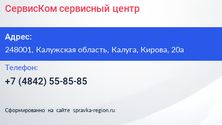 СервисКом, сервисный центр по адресу 248001, Калужская область, Калуга, Кирова, 20а в дальнейшем Организация, размещена в следующих категориях: