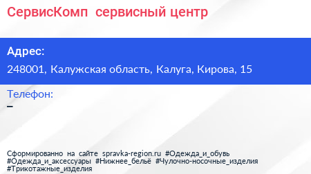 СервисКомп+, сервисный центр по адресу 248001, Калужская область, Калуга, Кирова, 15 в дальнейшем Организация, размещена в следующих категориях:
