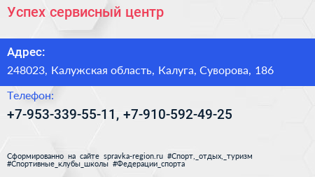 Успех, сервисный центр по адресу 248023, Калужская область, Калуга, Суворова, 186 в дальнейшем Организация, размещена в следующих категориях: