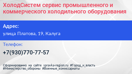 ХолодСистем - сервис промышленного и коммерческого холодильного оборудования по адресу улица Платова, 19, Калуга в дальнейшем Организация, размещена в следующих категориях: