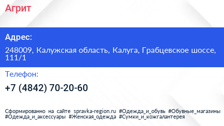 Агрит по адресу 248009, Калужская область, Калуга, Грабцевское шоссе, 111/1 в дальнейшем Организация, размещена в следующих категориях: