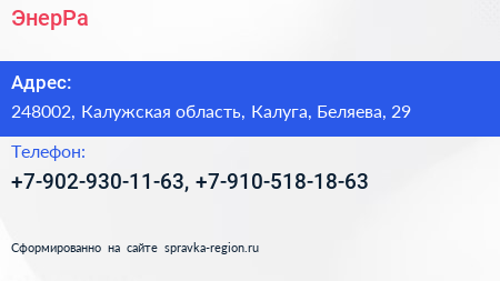 ЭнерРа по адресу 248002, Калужская область, Калуга, Беляева, 29 в дальнейшем Организация, размещена в следующих категориях: