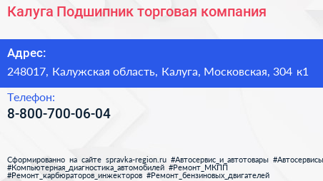 Калуга Подшипник, торговая компания по адресу 248017, Калужская область, Калуга, Московская, 304 к1 в дальнейшем Организация, размещена в следующих категориях: