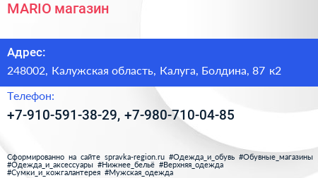 MARIO, магазин по адресу 248002, Калужская область, Калуга, Болдина, 87 к2 в дальнейшем Организация, размещена в следующих категориях: