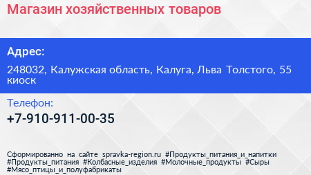 Магазин хозяйственных товаров по адресу 248032, Калужская область, Калуга, Льва Толстого, 55 киоск в дальнейшем Организация, размещена в следующих категориях: