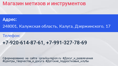 Магазин метизов и инструментов по адресу 248001, Калужская область, Калуга, Дзержинского, 17 в дальнейшем Организация, размещена в следующих категориях: