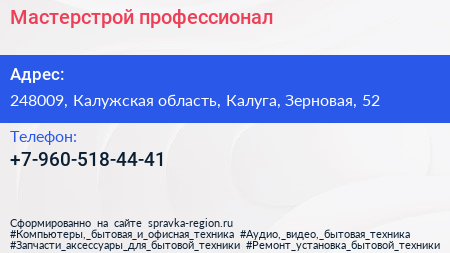 Мастерстрой-профессионал по адресу 248009, Калужская область, Калуга, Зерновая, 52 в дальнейшем Организация, размещена в следующих категориях: