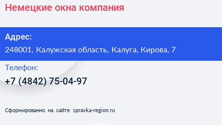 Немецкие окна, компания по адресу 248001, Калужская область, Калуга, Кирова, 7 в дальнейшем Организация, размещена в следующих категориях: