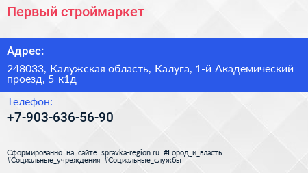 Первый, строймаркет по адресу 248033, Калужская область, Калуга, 1-й Академический проезд, 5 к1д в дальнейшем Организация, размещена в следующих категориях: