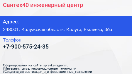 Сантех40, инженерный центр по адресу 248001, Калужская область, Калуга, Рылеева, 36а в дальнейшем Организация, размещена в следующих категориях: