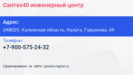 Сантех40, инженерный центр по адресу 248029, Калужская область, Калуга, Гурьянова, 69 в дальнейшем Организация, размещена в следующих категориях: