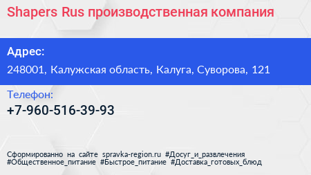 Shapers Rus, производственная компания по адресу 248001, Калужская область, Калуга, Суворова, 121 в дальнейшем Организация, размещена в следующих категориях: