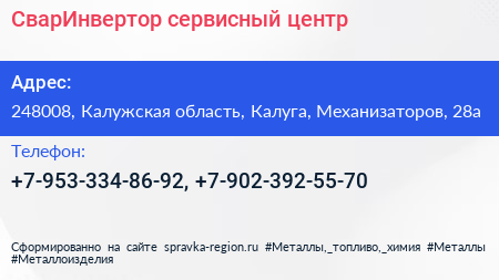 СварИнвертор, сервисный центр по адресу 248008, Калужская область, Калуга, Механизаторов, 28а в дальнейшем Организация, размещена в следующих категориях: