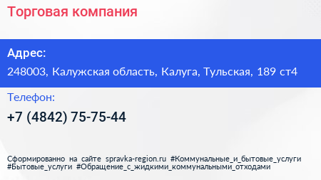 Торговая компания по адресу 248003, Калужская область, Калуга, Тульская, 189 ст4 в дальнейшем Организация, размещена в следующих категориях:
