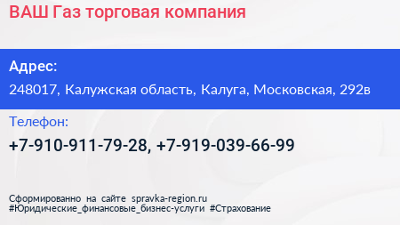 ВАШ-Газ, торговая компания по адресу 248017, Калужская область, Калуга, Московская, 292в в дальнейшем Организация, размещена в следующих категориях: