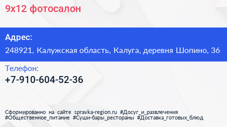 9x12, фотосалон по адресу 248921, Калужская область, Калуга, деревня Шопино, 36 в дальнейшем Организация, размещена в следующих категориях: