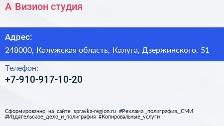 А`Визион, студия по адресу 248000, Калужская область, Калуга, Дзержинского, 51 в дальнейшем Организация, размещена в следующих категориях: