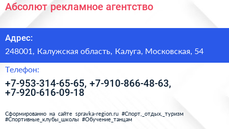 Абсолют, рекламное агентство по адресу 248001, Калужская область, Калуга, Московская, 54 в дальнейшем Организация, размещена в следующих категориях: