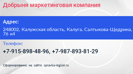 Добрыня, маркетинговая компания по адресу 248002, Калужская область, Калуга, Салтыкова-Щедрина, 76 к4 в дальнейшем Организация, размещена в следующих категориях: