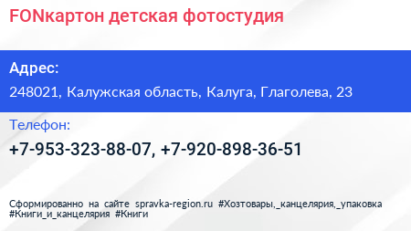 FONкартон, детская фотостудия по адресу 248021, Калужская область, Калуга, Глаголева, 23 в дальнейшем Организация, размещена в следующих категориях: