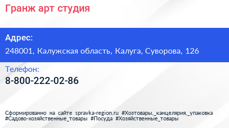 Гранж, арт-студия по адресу 248001, Калужская область, Калуга, Суворова, 126 в дальнейшем Организация, размещена в следующих категориях: