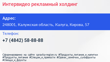 Интервидео, рекламный холдинг по адресу 248001, Калужская область, Калуга, Кирова, 57 в дальнейшем Организация, размещена в следующих категориях: