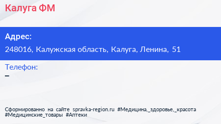 Калуга ФМ по адресу 248016, Калужская область, Калуга, Ленина, 51 в дальнейшем Организация, размещена в следующих категориях: