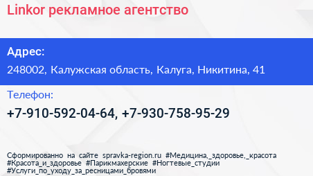 Linkor, рекламное агентство по адресу 248002, Калужская область, Калуга, Никитина, 41 в дальнейшем Организация, размещена в следующих категориях: