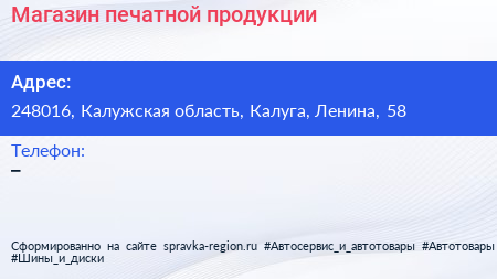 Магазин печатной продукции по адресу 248016, Калужская область, Калуга, Ленина, 58 в дальнейшем Организация, размещена в следующих категориях:
