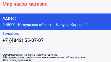 Мир часов, магазин по адресу 248001, Калужская область, Калуга, Кирова, 1 в дальнейшем Организация, размещена в следующих категориях: